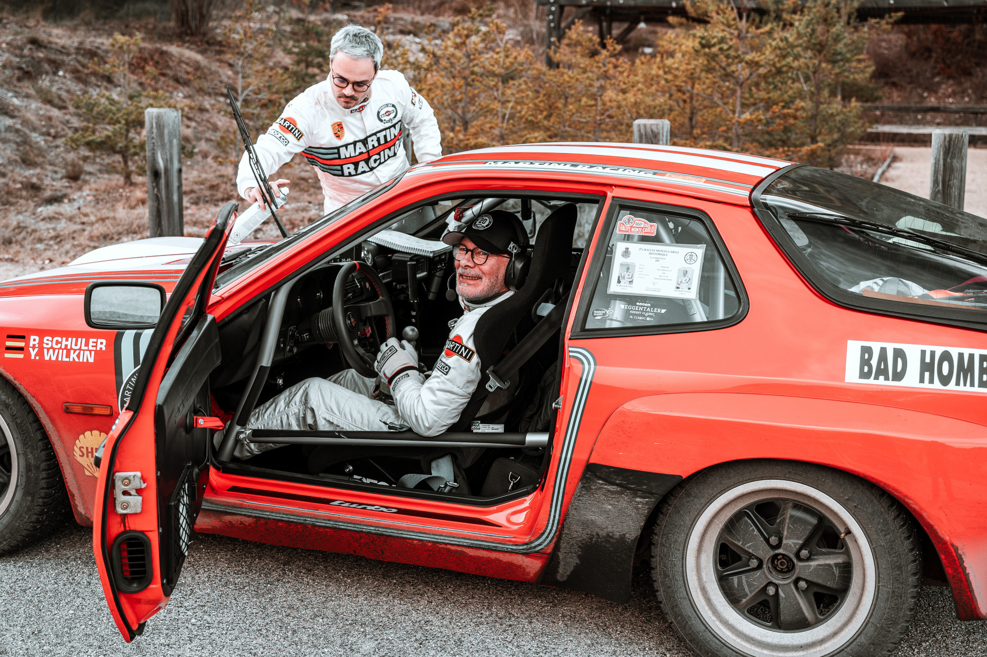 Peter Schuler, directeur général de la KÜS, et Yannic Wilkin, copilote, dans la Porsche 924 Carrera GT.
